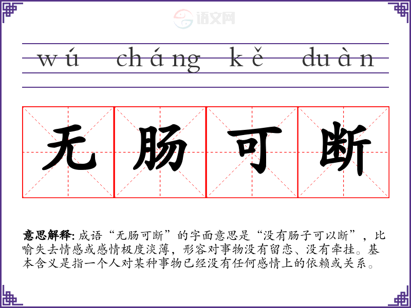 成语“无肠可断”的字面意思是“没有肠子可以断”,比喻失去情感或感情极度淡*,形容对事物没有留恋、没有牵挂。基本含义是指一个人对某种事物已经没有任何感情上的依赖或关系。