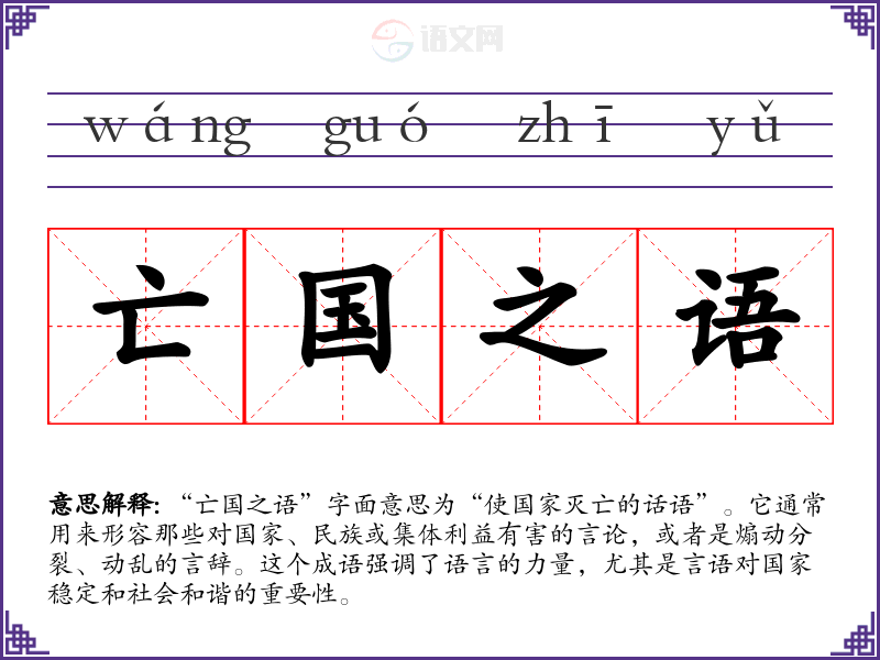 “亡国之语”字面意思为“使国家灭亡的话语”。它通常用来形容那些对国家、民族或集体利益有害的言论,或者是煽动分裂、动乱的言辞。这个成语强调了语言的力量,尤其是言语对国家稳定和社会和谐的重要性。