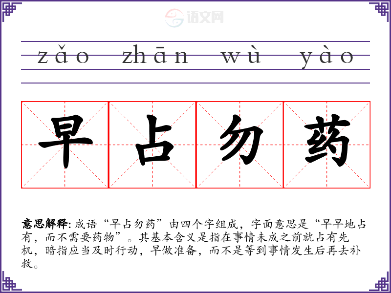 成语“早占勿药”由四个字组成,字面意思是“早早地占有,而不需要药物”。其基本含义是指在事情未成之前就占有先机,暗指应当及时行动,早做准备,而不是等到事情发生后再去补救。