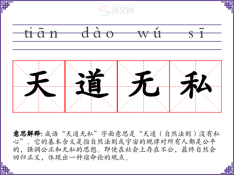 成语“天道无私”字面意思是“天道(自然法则)没有私心”。它的基本含义是指自然法则或宇宙的规律对所有人都是公平的,强调公正和无私的思想。即使在社会上存在不公,最终自然会回归正义,体现出一种宿命论的观点。
