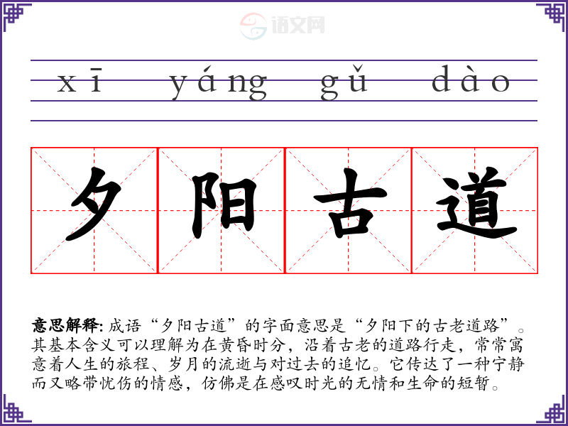 成语“夕阳古道”的字面意思是“夕阳下的古老道路”。其基本含义可以理解为在黄昏时分,沿着古老的道路行走,常常寓意着人生的旅程、岁月的流逝与对过去的追忆。它传达了一种宁静而又略带忧伤的情感,仿佛是在感叹时光的无情和生命的短暂。