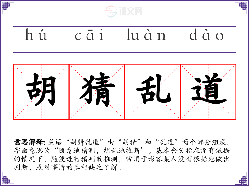成语“胡猜乱道”由“胡猜”和“乱道”两个部分组成。字面意思为“随意地猜测,胡乱地推断”。基本含义指在没有依据的情况下,随便进行猜测或推测,常用于形容某人没有根据地做出判断,或对事情的真相缺乏了解。