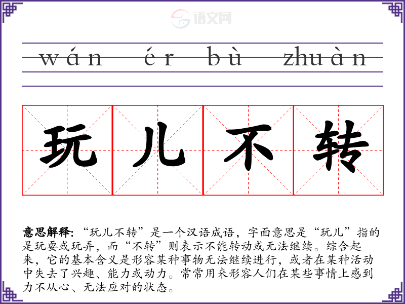 “玩儿不转”是一个汉语成语,字面意思是“玩儿”指的是玩耍或玩弄,而“不转”则表示不能转动或无法继续。综合起来,它的基本含义是形容某种事物无法继续进行,或者在某种活动中失去了兴趣、能力或动力。常常用来形容人们在某些事情上感到力不从心、无法应对的状态。