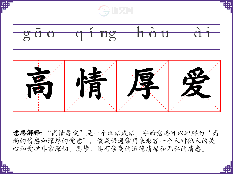“高情厚爱”是一个汉语成语,字面意思可以理解为“高尚的情感和深厚的爱意”。该成语通常用来形容一个人对他人的关心和爱护非常深切、真挚,具有崇高的道德情操和无私的情感。