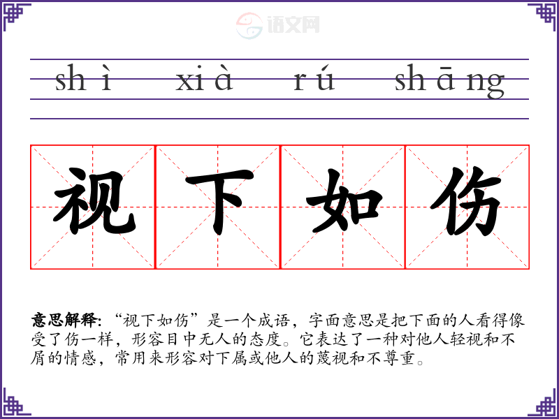 “视下如伤”是一个成语,字面意思是把下面的人看得像受了伤一样,形容目中无人的态度。它表达了一种对他人轻视和不屑的情感,常用来形容对下属或他人的蔑视和不尊重。