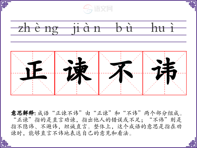 成语“正谏不讳”由“正谏”和“不讳”两个部分组成。“正谏”指的是直言劝谏,指出他人的错误或不足;“不讳”则是指不隐讳、不避讳,坦诚直言。整体上,这个成语的意思是指在劝谏时,能够直言不讳地表达自己的意见和看法。