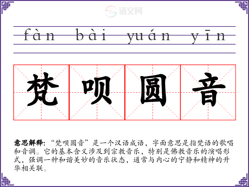 “梵呗圆音”是一个汉语成语,字面意思是指梵语的歌唱和音调。它的基本含义涉及到音乐,特别是音乐的演唱形式,强调一种和谐美妙的音乐状态,通常与内心的宁静和精神的升华相关联。