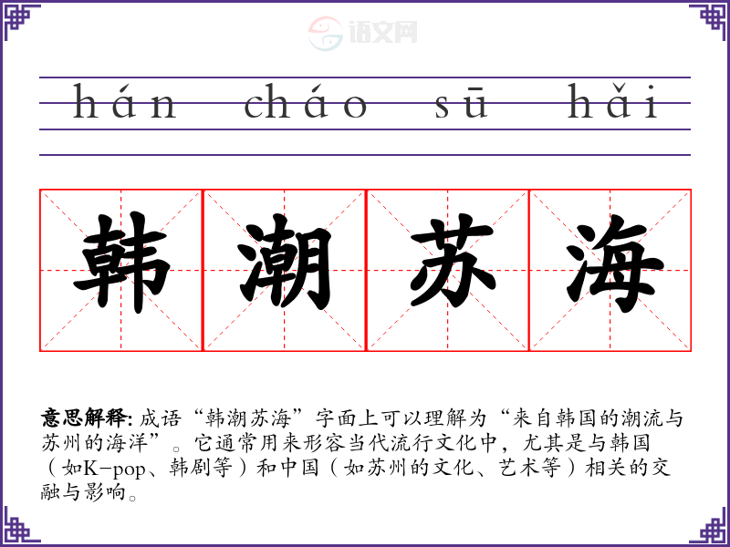 成语“韩潮苏海”字面上可以理解为“来自韩国的潮流与苏州的海洋”。它通常用来形容当代流行文化中,尤其是与韩国(如K-pop、韩剧等)和**(如苏州的文化、艺术等)相关的交融与影响。