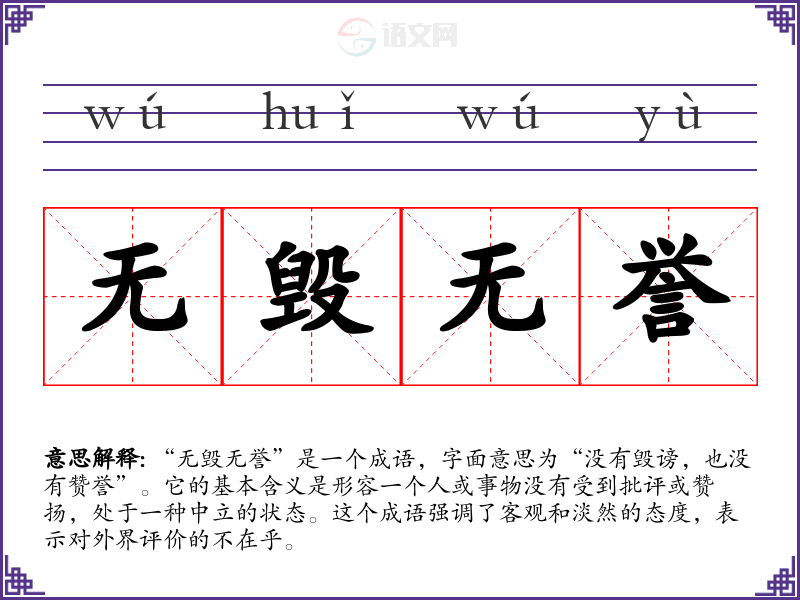 “无毁无誉”是一个成语,字面意思为“没有毁谤,也没有赞誉”。它的基本含义是形容一个人或事物没有受到批评或赞扬,处于一种中立的状态。这个成语强调了客观和淡然的态度,表示对外界评价的不在乎。