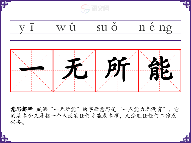 成语“一无所能”的字面意思是“一点能力都没有”。它的基本含义是指一个人没有任何才能或本事,无法胜任任何工作或任务。