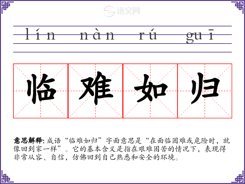 成语“临难如归”字面意思是“在面临困难或危险时,就像回到家一样”。它的基本含义是指在艰难困苦的情况下,表现得非常从容、自信,仿佛回到自己熟悉和安全的环境。