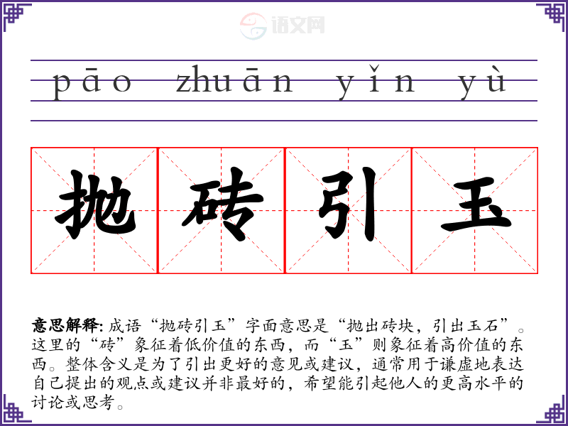 成语“抛砖引玉”字面意思是“抛出砖块,引出玉石”。这里的“砖”象征着低价值的东西,而“玉”则象征着高价值的东西。整体含义是为了引出更好的意见或建议,通常用于谦虚地表达自己提出的观点或建议并非最好的,希望能引起他人的更高水平的讨论或思考。