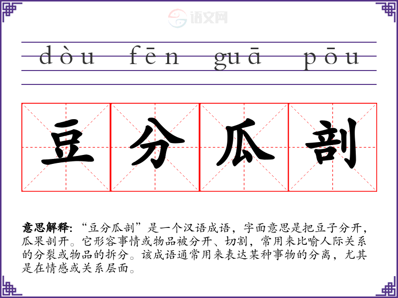 “豆分瓜剖”的具体来源并不详尽,可能是由古代诗词或民间故事演变而来。字面上看,豆子和瓜果都是常见的农作物,分开和剖开象征着自然界事物之间的分隔和变化。成语的形成与**传统文化中对自然和生活的观察密切相关。