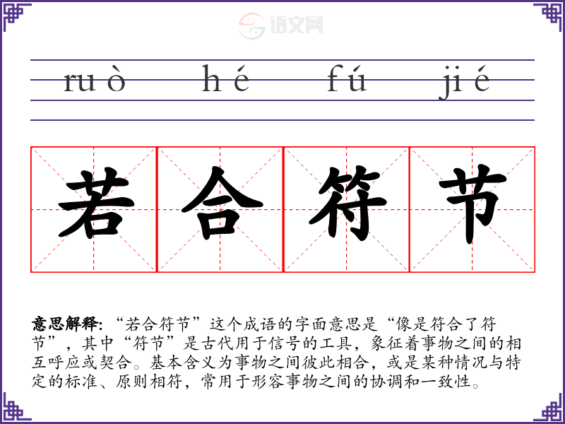 “若合符节”这个成语的字面意思是“像是符合了符节”,其中“符节”是古代用于信号的工具,象征着事物之间的相互呼应或契合。基本含义为事物之间彼此相合,或是某种情况与特定的标准、原则相符,常用于形容事物之间的协调和一致性。