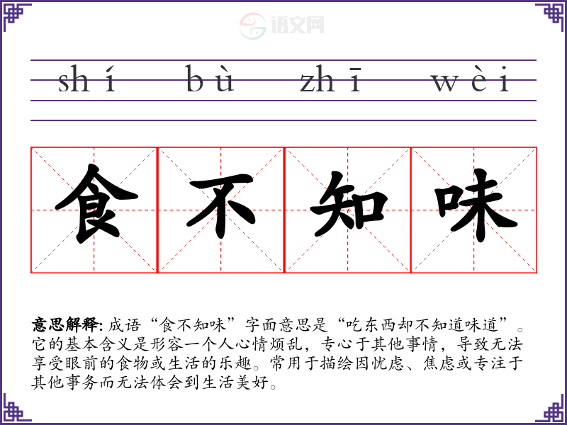 成语“食不知味”字面意思是“吃东西却不知道味道”。它的基本含义是形容一个人心情烦乱,专心于其他事情,导致无法享受眼前的食物或生活的乐趣。常用于描绘因忧虑、焦虑或专注于其他事务而无法体会到生活美好。