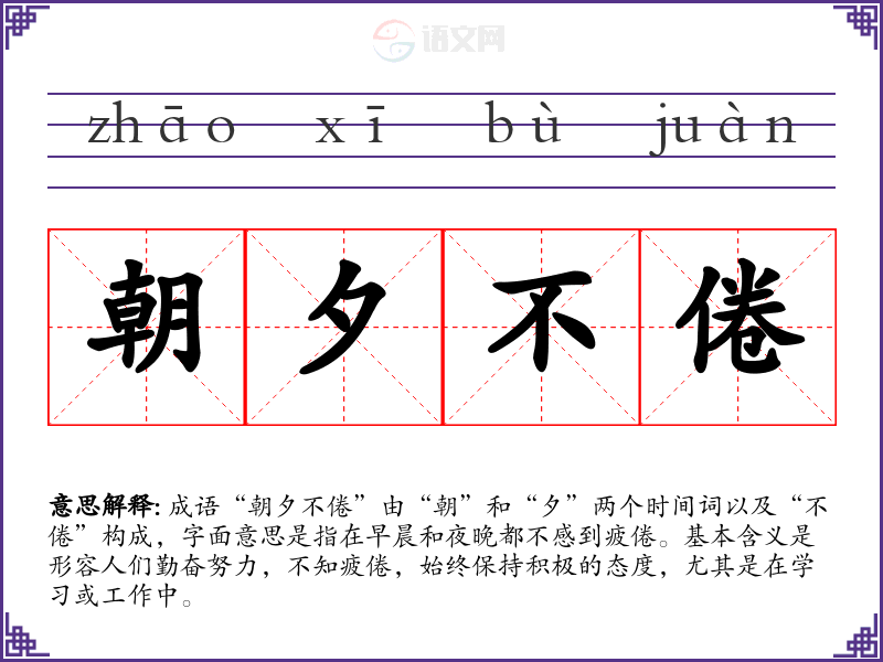 成语“朝夕不倦”由“朝”和“夕”两个时间词以及“不倦”构成,字面意思是指在早晨和夜晚都不感到疲倦。基本含义是形容人们勤奋努力,不知疲倦,始终保持积极的态度,尤其是在学*或工作中。