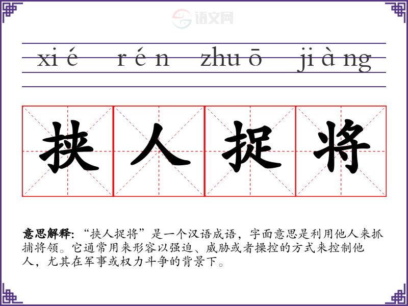 “挟人捉将”是一个汉语成语,字面意思是利用他人来抓捕将领。它通常用来形容以强迫、威胁或者操控的方式来控制他人,尤其在军事或权力斗争的背景下。