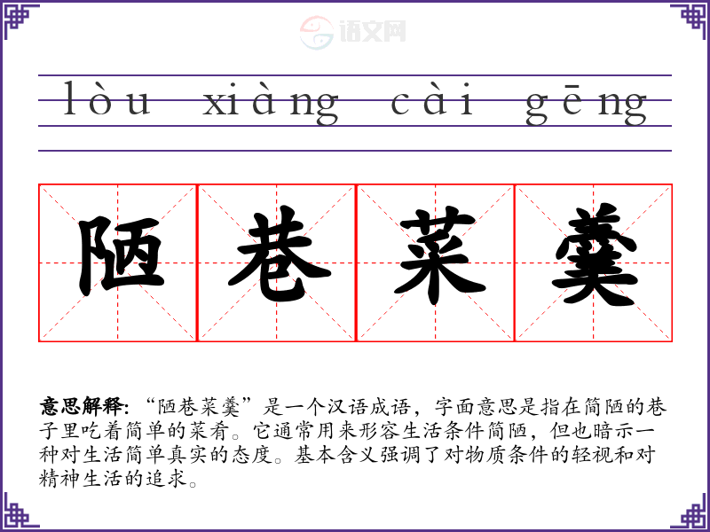 “陋巷菜羹”是一个汉语成语,字面意思是指在简陋的巷子里吃着简单的菜肴。它通常用来形容生活条件简陋,但也暗示一种对生活简单真实的态度。基本含义强调了对物质条件的轻视和对精神生活的追求。