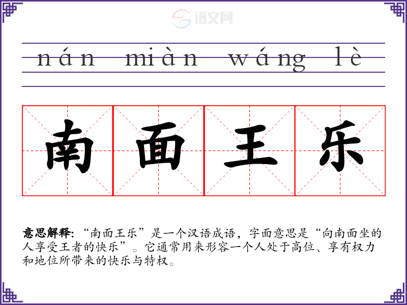 “南面王乐”是一个汉语成语,字面意思是“向南面坐的人享受王者的快乐”。它通常用来形容一个人处于高位、享有权力和地位所带来的快乐与特权。