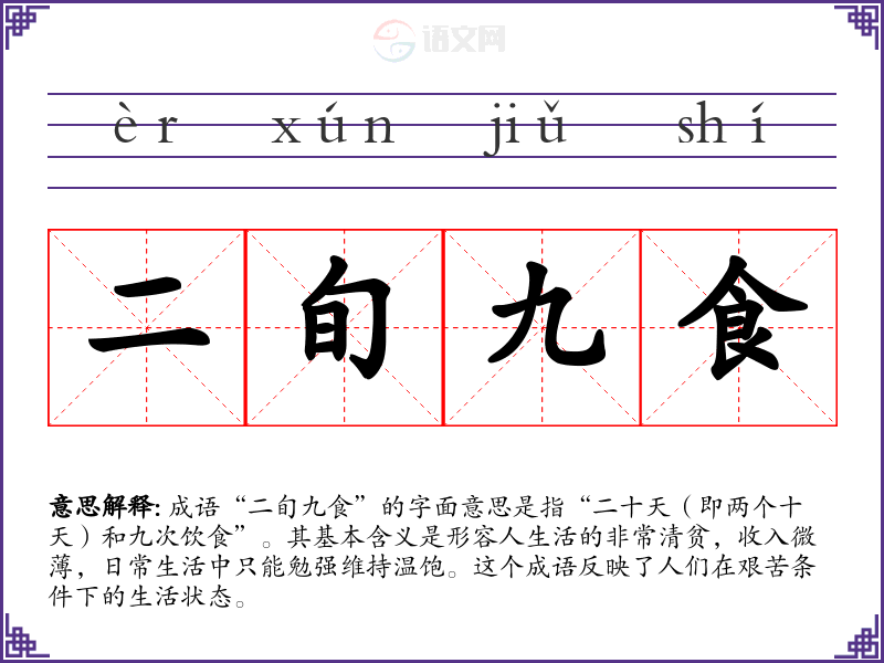 成语“二旬九食”的字面意思是指“二十天(即两个十天)和九次饮食”。其基本含义是形容人生活的非常清贫,收入微*,日常生活中只能勉强维持温饱。这个成语反映了人们在艰苦条件下的生活状态。