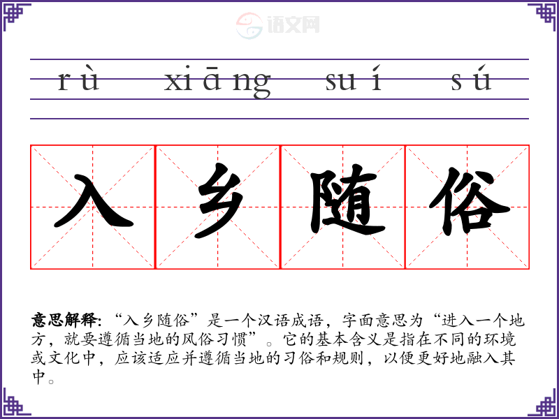 “入乡随俗”是一个汉语成语,字面意思为“进入一个地方,就要遵循当地的风俗惯”。它的基本含义是指在不同的环境或文化中,应该适应并遵循当地的俗和规则,以便更好地融入其中。