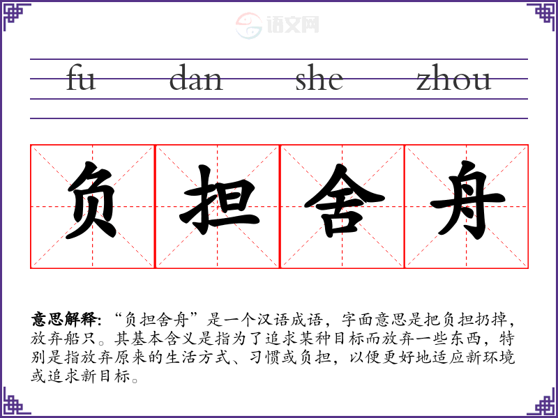 “负担舍舟”是一个汉语成语,字面意思是把负担扔掉,放弃船只。其基本含义是指为了追求某种目标而放弃一些东西,特别是指放弃原来的生活方式、习惯或负担,以便更好地适应新环境或追求新目标。