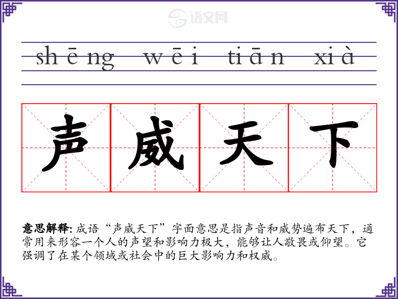 成语“声威天下”字面意思是指声音和威势遍布天下,通常用来形容一个人的声望和影响力极大,能够让人敬畏或仰望。它强调了在某个领域或社会中的巨大影响力和权威。