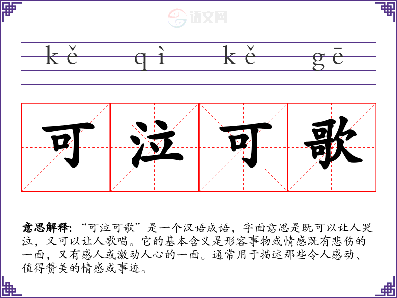“可泣可歌”是一个汉语成语,字面意思是既可以让人哭泣,又可以让人歌唱。它的基本含义是形容事物或情感既有悲伤的一面,又有感人或激动人心的一面。通常用于描述那些令人感动、值得赞美的情感或事迹。