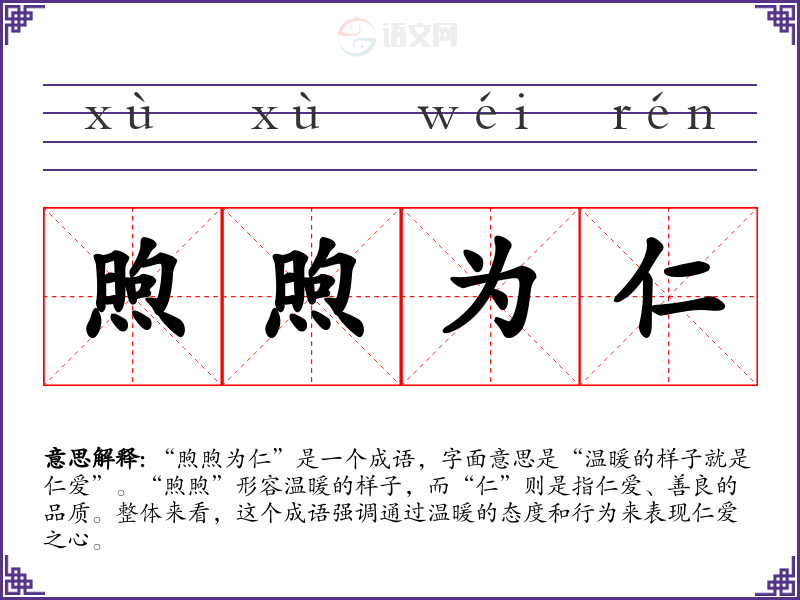 “煦煦为仁”是一个成语,字面意思是“温暖的样子就是仁爱”。“煦煦”形容温暖的样子,而“仁”则是指仁爱、善良的品质。整体来看,这个成语强调通过温暖的态度和行为来表现仁爱之心。