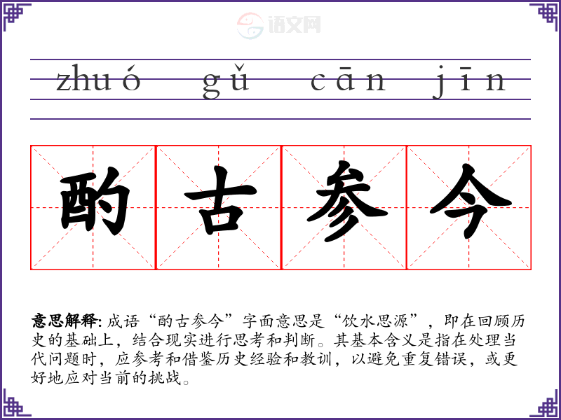 成语“酌古参今”字面意思是“饮水思源”,即在回顾历史的基础上,结合现实进行思考和判断。其基本含义是指在处理当代问题时,应参考和借鉴历史经验和教训,以避免重复错误,或更好地应对当前的挑战。