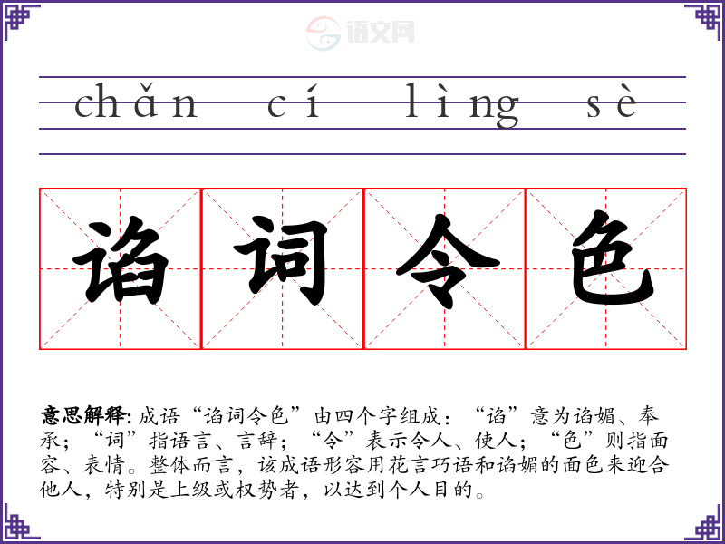 成语“谄词令色”由四个字组成:“谄”意为谄媚、奉承;“词”指语言、言辞;“令”表示令人、使人;“色”则指面容、表情。整体而言,该成语形容用花言巧语和谄媚的面色来迎合他人,特别是上级或权势者,以达到个人目的。