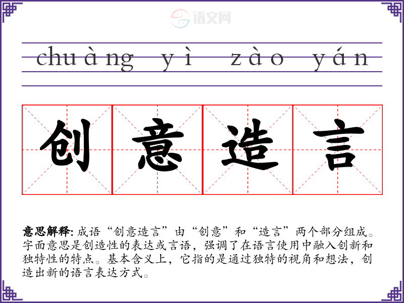成语“创意造言”由“创意”和“造言”两个部分组成。字面意思是创造性的表达或言语,强调了在语言使用中融入创新和独特性的特点。基本含义上,它指的是通过独特的视角和想法,创造出新的语言表达方式。