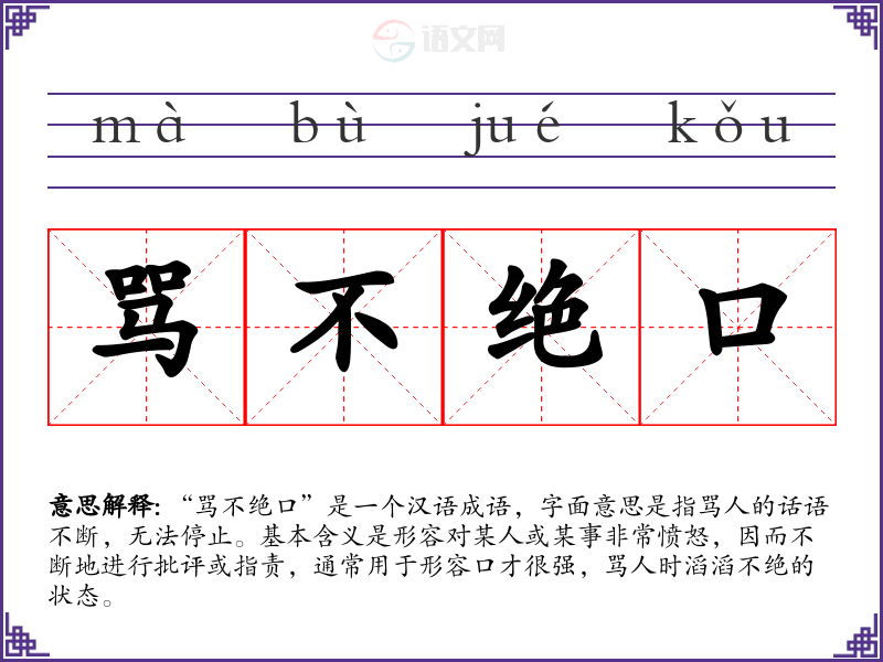 “骂不绝口”是一个汉语成语,字面意思是指骂人的话语不断,无法停止。基本含义是形容对某人或某事非常愤怒,因而不断地进行批评或指责,通常用于形容口才很强,骂人时滔滔不绝的状态。