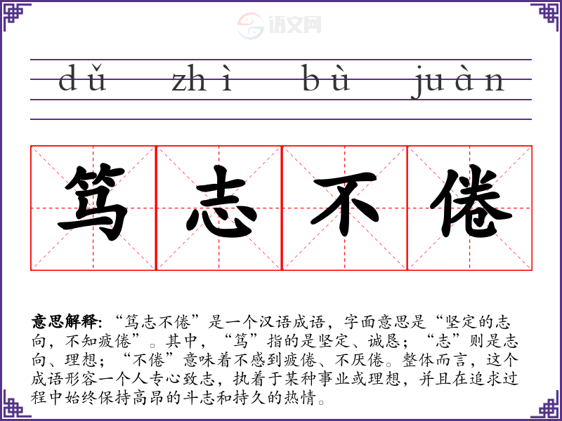 “笃志不倦”是一个汉语成语,字面意思是“坚定的志向,不知疲倦”。其中,“笃”指的是坚定、诚恳;“志”则是志向、理想;“不倦”意味着不感到疲倦、不厌倦。整体而言,这个成语形容一个人专心致志,执着于某种事业或理想,并且在追求过程中始终保持高昂的斗志和持久的热情。