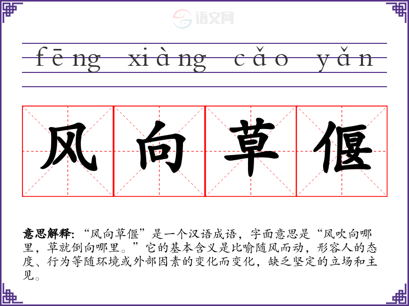 “风向草偃”是一个汉语成语,字面意思是“风吹向哪里,草就倒向哪里。”它的基本含义是比喻随风而动,形容人的态度、行为等随环境或外部因素的变化而变化,缺乏坚定的立场和主见。