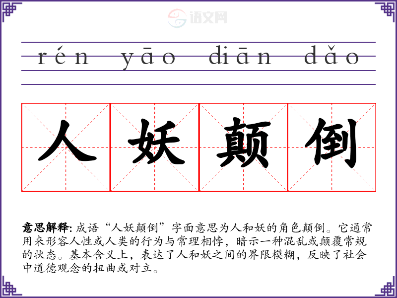 成语“人妖颠倒”字面意思为人和妖的角色颠倒。它通常用来形容人性或人类的行为与常理相悖,暗示一种混乱或颠覆常规的状态。基本含义上,表达了人和妖之间的界限模糊,反映了社会中道德观念的扭曲或对立。