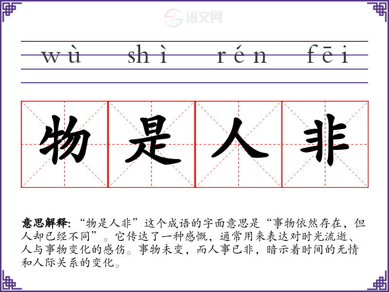 “物是人非”这个成语的字面意思是“事物依然存在,但人却已经不同”。它传达了一种感慨,通常用来表达对时光流逝、人与事物变化的感伤。事物未变,而人事已非,暗示着时间的无情和人际关系的变化。