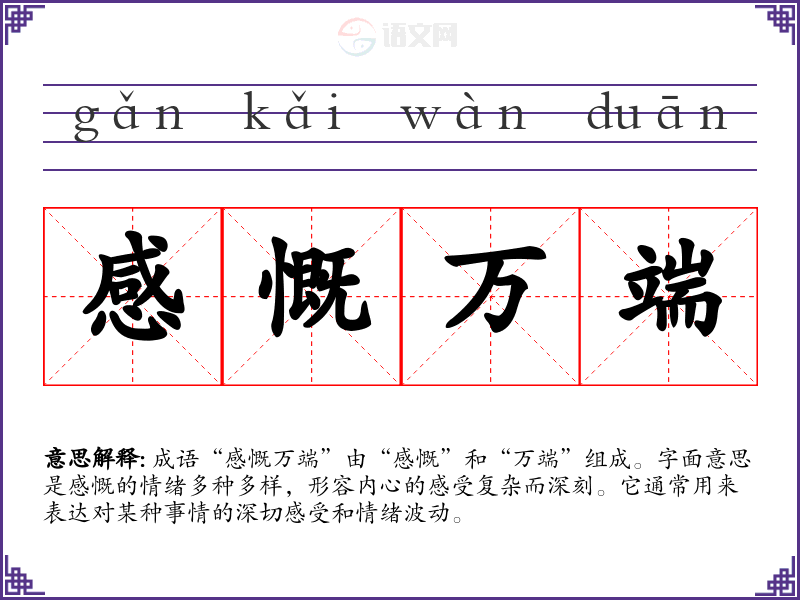 成语“感慨万端”由“感慨”和“万端”组成。字面意思是感慨的情绪多种多样,形容内心的感受复杂而深刻。它通常用来表达对某种事情的深切感受和情绪波动。