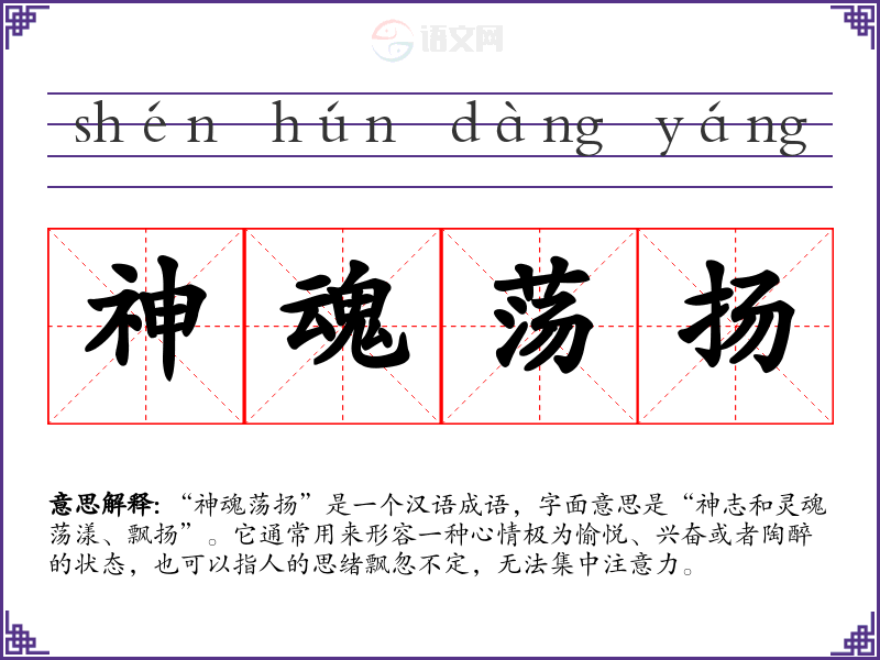 “神魂荡扬”是一个汉语成语,字面意思是“神志和灵魂荡漾、飘扬”。它通常用来形容一种心情极为愉悦、兴奋或者陶醉的状态,也可以指人的思绪飘忽不定,无法集中注意力。