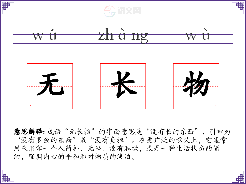 成语“无长物”的字面意思是“没有长的东西”,引申为“没有多余的东西”或“没有负担”。在更广泛的意义上,它通常用来形容一个人简朴、无私、没有私欲,或是一种生活状态的简约,强调内心的平和和对物质的淡泊。