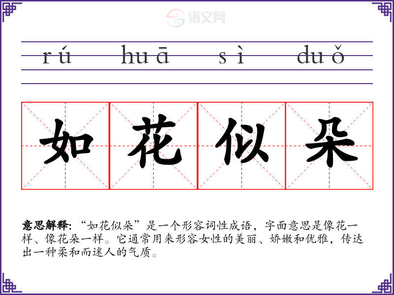 “如花似朵”是一个形容词性成语,字面意思是像花一样、像花朵一样。它通常用来形容女性的美丽、娇嫩和优雅,传达出一种柔和而迷人的气质。
