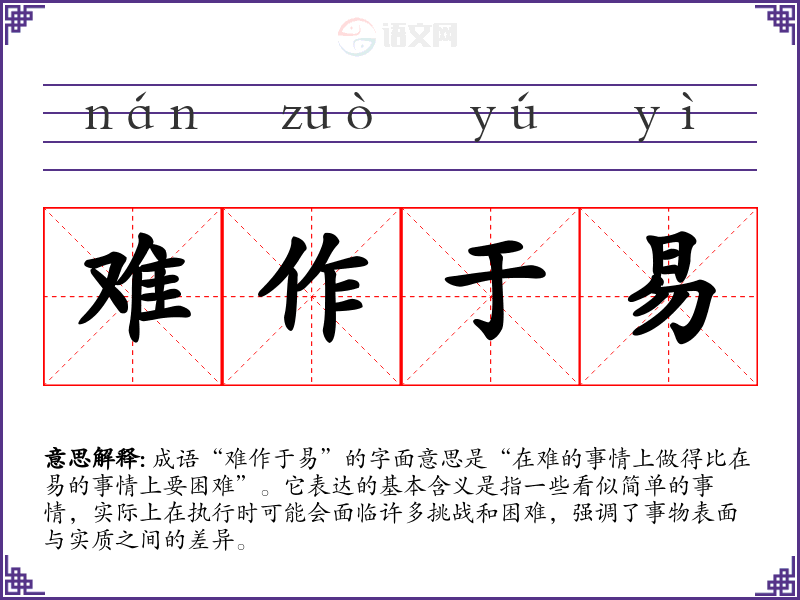 成语“难作于易”的字面意思是“在难的事情上做得比在易的事情上要困难”。它表达的基本含义是指一些看似简单的事情,实际上在执行时可能会面临许多挑战和困难,强调了事物表面与实质之间的差异。
