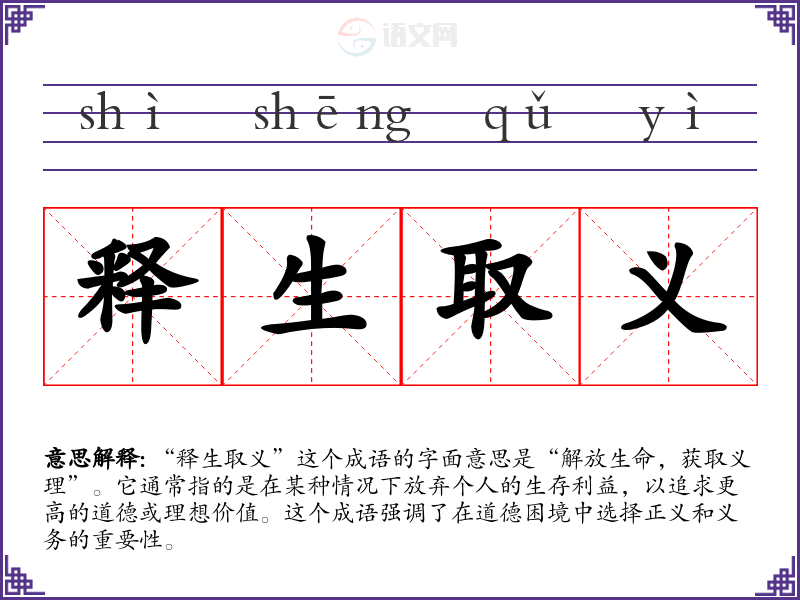 “释生取义”这个成语的字面意思是“解放生命,获取义理”。它通常指的是在某种情况下放弃个人的生存利益,以追求更高的道德或理想价值。这个成语强调了在道德困境中选择正义和义务的重要性。