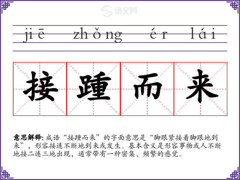成语“接踵而来”的字面意思是“脚跟紧接着脚跟地到来”,形容接连不断地到来或发生。基本含义是形容事物或人不断地接二连三地出现,通常带有一种密集、频繁的感觉。