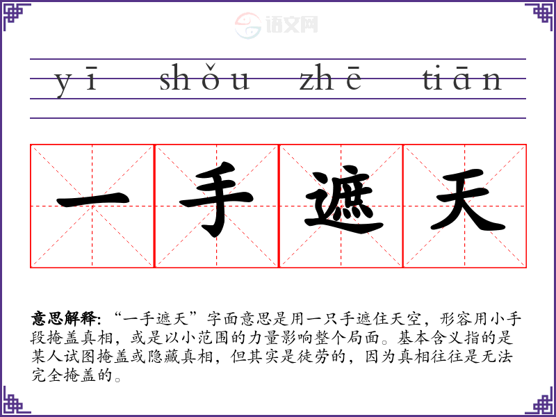 “一手遮天”字面意思是用一只手遮住天空,形容用小手段掩盖真相,或是以小范围的力量影响整个局面。基本含义指的是某人试图掩盖或隐藏真相,但其实是徒劳的,因为真相往往是无法完全掩盖的。