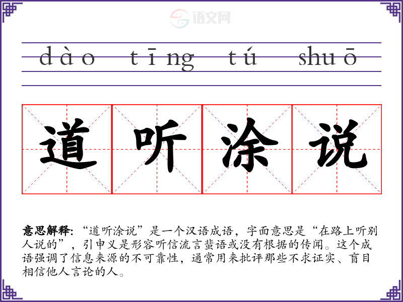- 演讲:演讲者在倡导理性思考时,可能会提到这个成语,以呼吁听众验证信息源:“在信息泛滥的时代,我们更要警惕道听涂说。”