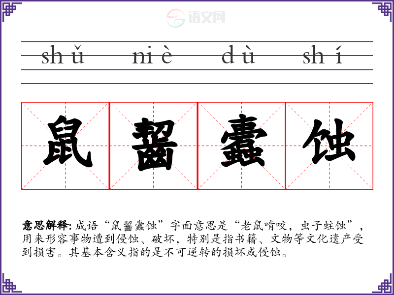 成语“鼠齧蠹蚀”字面意思是“老鼠啃咬,虫子蛀蚀”,用来形容事物遭到侵蚀、破坏,特别是指书籍、文物等文化遗产受到损害。其基本含义指的是不可逆转的损坏或侵蚀。