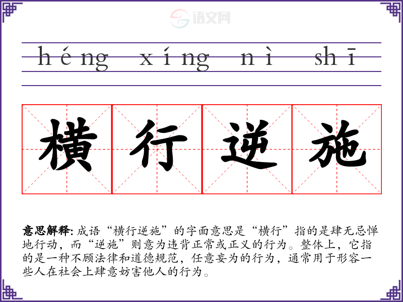 成语“横行逆施”的字面意思是“横行”指的是肆无忌惮地行动,而“逆施”则意为违背正常或正义的行为。整体上,它指的是一种不顾法律和道德规范,任意妄为的行为,通常用于形容一些人在社会上肆意妨害他人的行为。