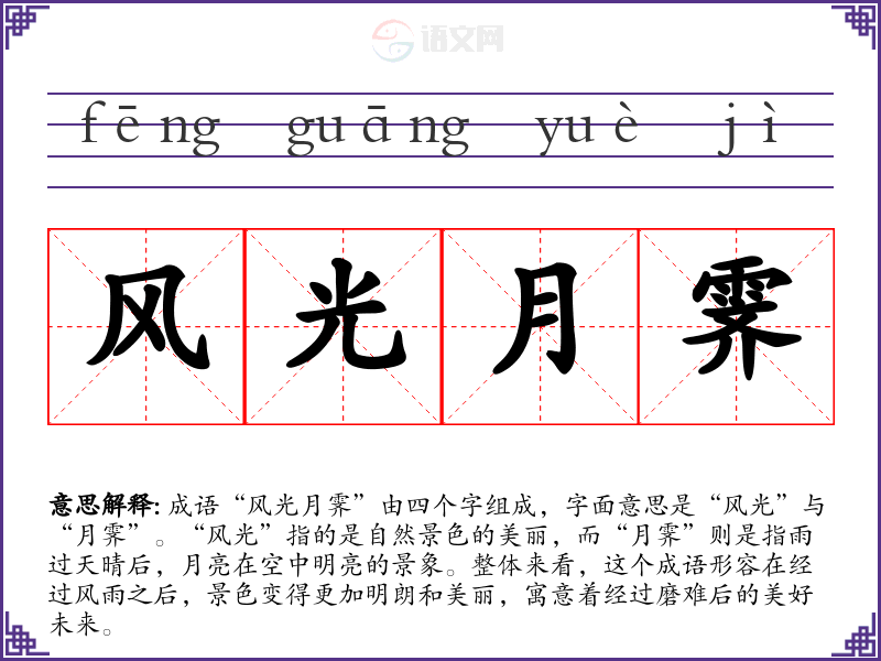 成语“风光月霁”由四个字组成,字面意思是“风光”与“月霁”。“风光”指的是自然景色的美丽,而“月霁”则是指雨过天晴后,月亮在空中明亮的景象。整体来看,这个成语形容在经过风雨之后,景色变得更加明朗和美丽,寓意着经过磨难后的美好未来。