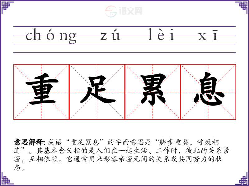 成语“重足累息”的字面意思是“脚步重叠,呼吸相连”。其基本含义指的是人们在一起生活、工作时,彼此的关系紧密,互相依赖。它通常用来形容亲密无间的关系或共同努力的状态。